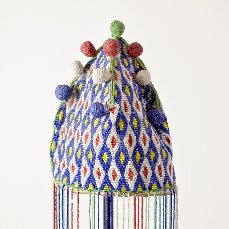 Crowns (Ade): The quintessential symbol of Yoruba kingship is the beaded crown, often conical with a veiled fringe of beads (ileke bibo) that obscures the king’s face, transforming him into a divine presence. These crowns are densely covered in blue, white, and red beads (colors associated with royalty and sacredness), often featuring birds (symbolizing wisdom and spiritual power) or faces (representing ancestral connection). Each crown is unique to its king and lineage, an object of immense spiritual and political power.